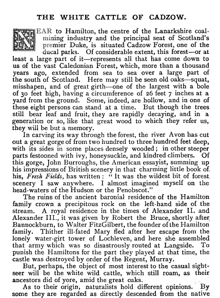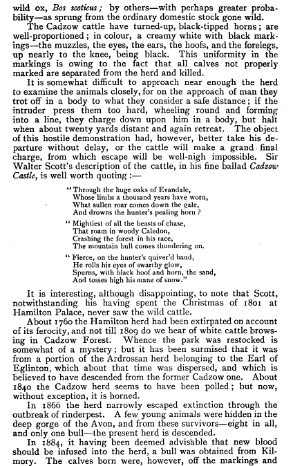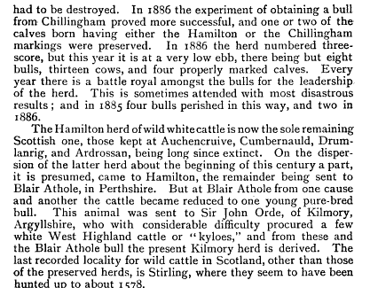 " The ancient history of this breed is involved in much mystery. From fossil remains, chiefly found in marl-pits, it appears that two species of the ox tribe formerly prevailed in Scotland, namely, the Bus taurus and the Bos urus. Some heads of these, of very large dimensions, are still preserved in the collections of the curious. Professor Fleming of Aberdeen informs us, that he has a skull of the former in his possession, measuring 17 1/2 inches in length, 9 inches between the horns, and 11 1/2 inches across at the orbits. The accounts of ancient authors certainly allude to a species of wild cattle very different in their characters and dimensions from those of the present day. The favourite haunt of these animals from ancient times seems to have heen the Caledonia Sylva, or Caledonian Forest, which extended from Stirling, through Menteith and Stratherne, to Athol and Lochaher. It is descrihed by old authors as dividing the Picts from the Scots ; and, being well furnished with game, especially with fierce white bulls and kine, it was the place of both their huntings, and of their greatest controversies. Some say it took it's name from Calder, which signifies a hazel, or common nut-bush. The Roman historians delight much to talk of the furious white bulls which the Forest of Caledonia brought forth. In these early days, they are represented as of large size, and as possessing Juban densam, ac demissam instar leonis ; or, as Holinshed has it, ' crisp and curled manes like feires leonis.' At what period this great forest was destroyed, and the white cattle extirpated, is uncertain. Sir Robert Sibbald describes them, in his time, as denuded of their manes. In the sixteenth century, they seem to have become entirely extinct as a wild race, and, as we learn from Gesner, ' were all slain, except in that part which is called Cummernad. Another author informs us, that ' thocht thir bullis were bred in sindry boundis of the Colidin Wod, now be continal hunting and lust of insolent men, they are destroyit in all parts of Scotland, and nane of them left but allenerlie in Cumernald.' At what period the present breed were introduced to the royal chase at Cadzow, cannot now be well ascertained. It is well known that the Cummings were at one period proprietors of Cadzow and Cumbernauld, and it is likely that in their time the white cattle were in both places. But be that as it may, they have long been extirpated at Cumbernauld, while they have been preserved in great perfection at Hamilton. The universal tradition in Clydesdale is, that they have been at Cadzow from the remotest antiquity; and the probability is, that they are a part remaining of the establishment of our ancient British and Scottish kings. At present they are objects of great curiosity, both to the inhabitants and to strangers visiting the place. During the troubles consequent on the death of Charles I., and the usurpation of Cromwell, they were nearly extirpated ; but a breed of them having been retained for the Hamilton family, by Hamilton Dalzell, and by Lord Elphingstone, at Cumhernauld, they were subsequently restored in their original purity. A tradition prevails in the country, that, about a hundred years ago, when it was found necessary, for a time, to remove them from one pasture to another, several hundred individuals, belonging to the different baronies on the ducal estate, were called out, and that they only effected their purpose with much danger and difficulty. Instances are recorded of their having been taken when young, and tamed, and even milked. The milk, like that of most white cattle, is described as thin and watery. The usual number of ribs is thirteen on each side ; some have been slaughtered with fourteen pair of ribs, but this is exceedingly rare. There is no other park of cattle in Scotland of a similar description."